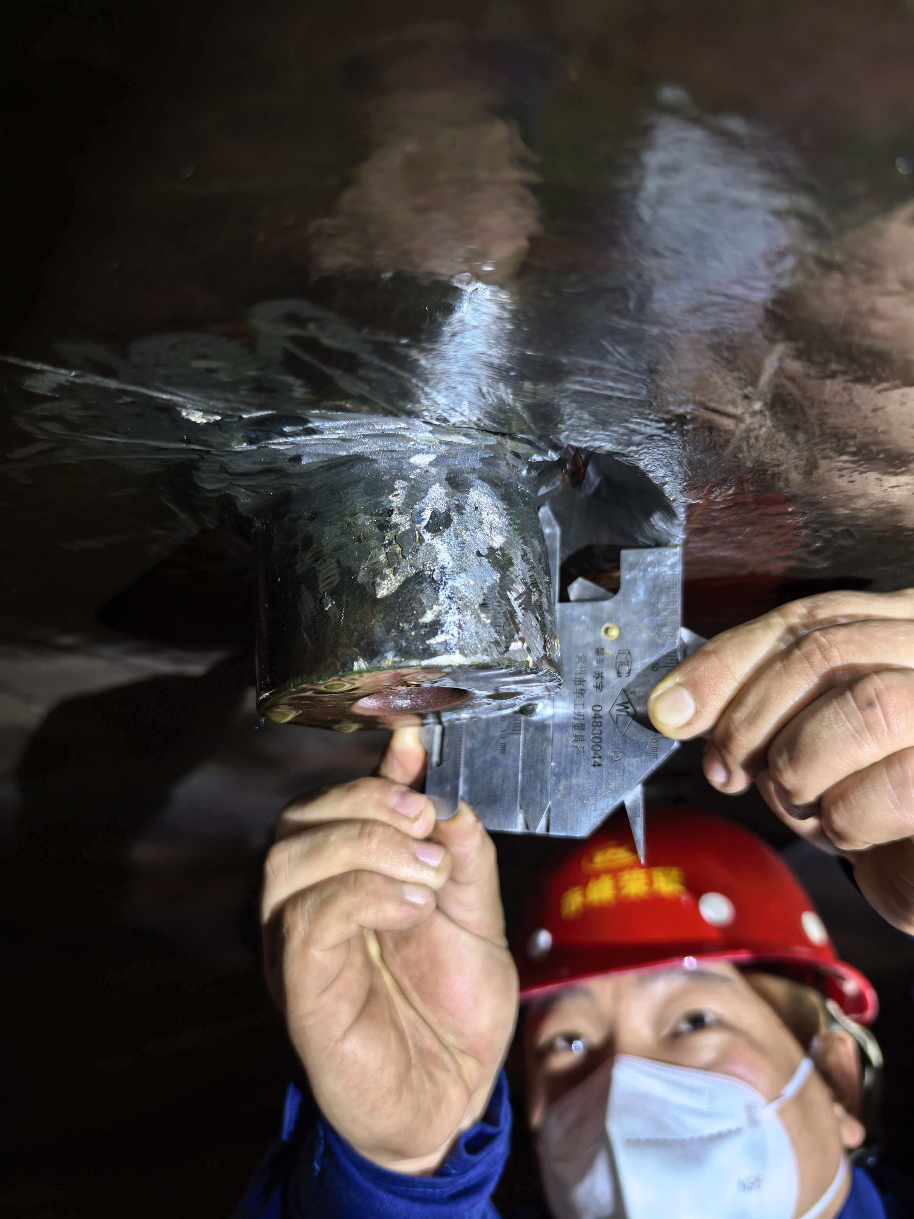 检测不仅要“查得出”,更要“量得准”。第二张图里,检测人员手持焊缝检验尺,对球罐焊接部位进行细致测量。焊脚高度、余高尺寸、坡口角度,每一个参数都直接影响球罐的结构强度与使用寿命。检测人员屏气凝神,将卡尺精准卡入焊缝,仔细读取刻度,确保每一项数据都真实、准确、可追溯。这看似简单的测量动作,背后是对特种设备安全规范的严格践行,是对“每一个数据都关乎安全”的深刻践行,为后续缺陷消除提供精准依据。