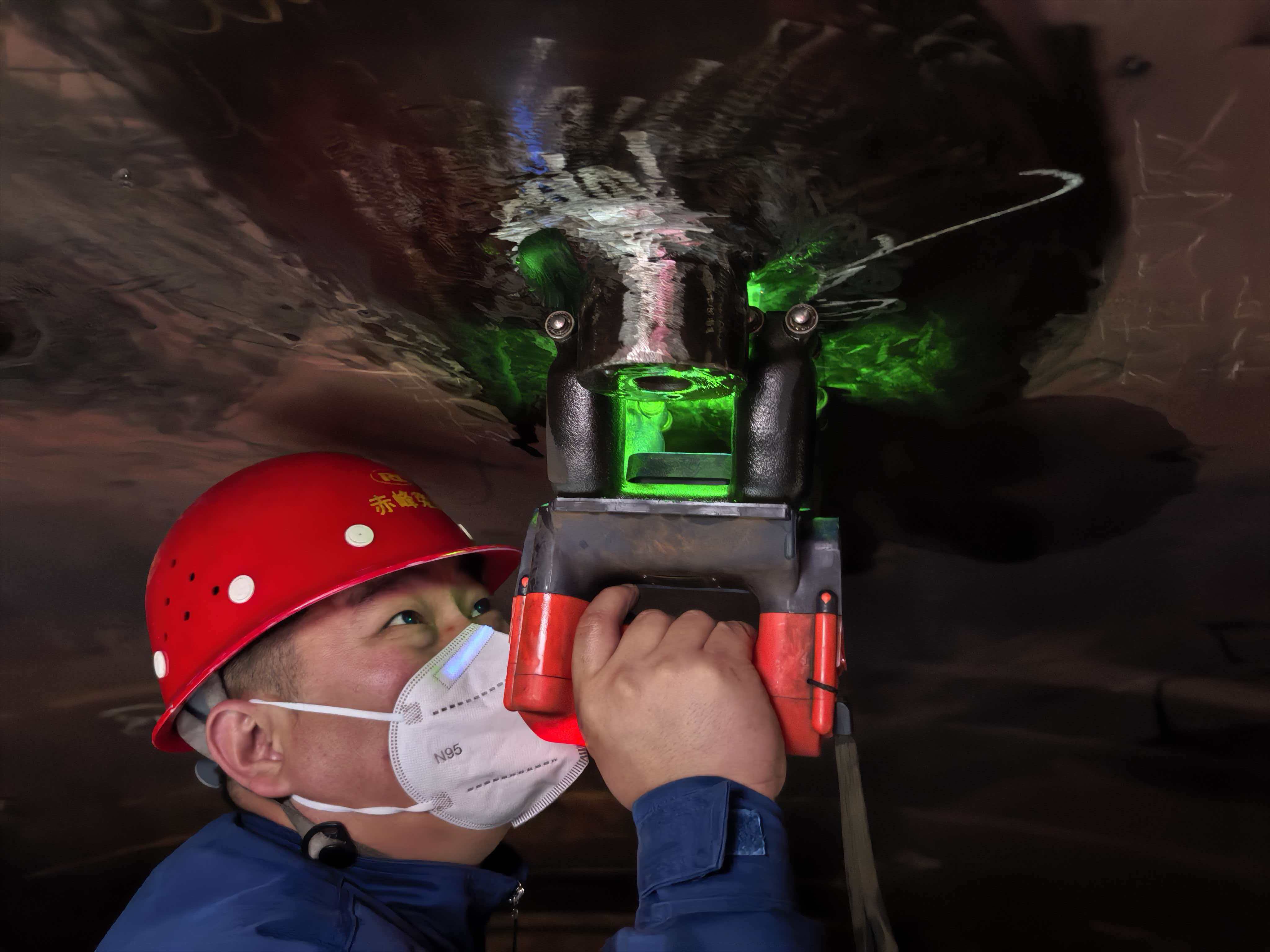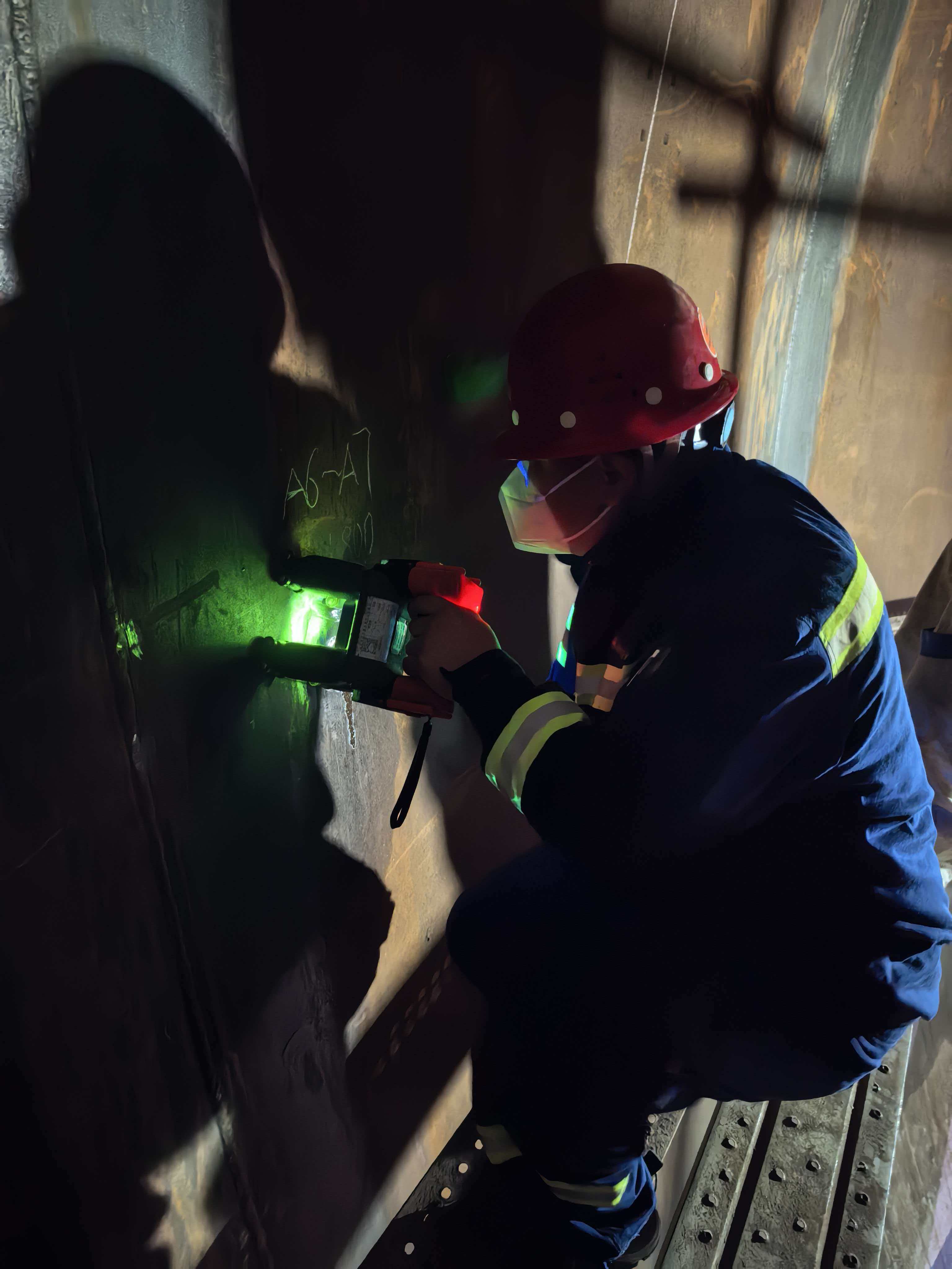 球罐内部空间密闭、光线昏暗,作业环境复杂严苛,对检测人员的技术、耐力与责任心都是极大考验。走进球罐,金属壁面的余温、密闭空间的闷热,丝毫没有影响检测人员的专注。第一张图中,检测人员身着专业工装、头戴安全帽,手持磁粉探伤仪,将仪器稳稳贴合在球罐壁面。仪器发出的绿色荧光,在昏暗的空间里成为“安全信号灯”,精准捕捉着焊缝处的细微裂纹、夹渣等表面缺陷。每一次仪器的贴合、每一处细节的观察,都凝聚着检测人员对标准的敬畏、对安全的坚守,他们用专业技术,让隐藏的缺陷无所遁形。